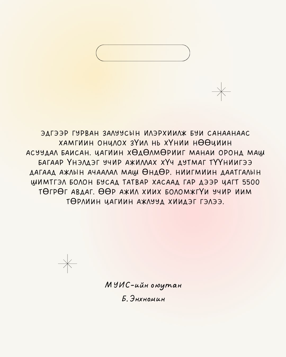 Европын Холбооны санхүүжилттэй НҮБ-ын Хөгжлийн хөтөлбөрөөс хэрэгжүүлж буй “Өөрчлөлтийн элч төлөөлөгчид: Хариуцлагатай бизнесийн төлөөх залуус ба хэвлэл мэдээлэл” төслийн хүрээнд бэлтгэв. Уг бүтээл нь зөвхөн зохиогчийн үзэл бодлыг илэрхийлэх бөгөөд Европын Холбоо, НҮБ-ын Хөгжлийн хөтөлбөрийн албан ёсны байр суурийг илэрхийлэхгүй.
