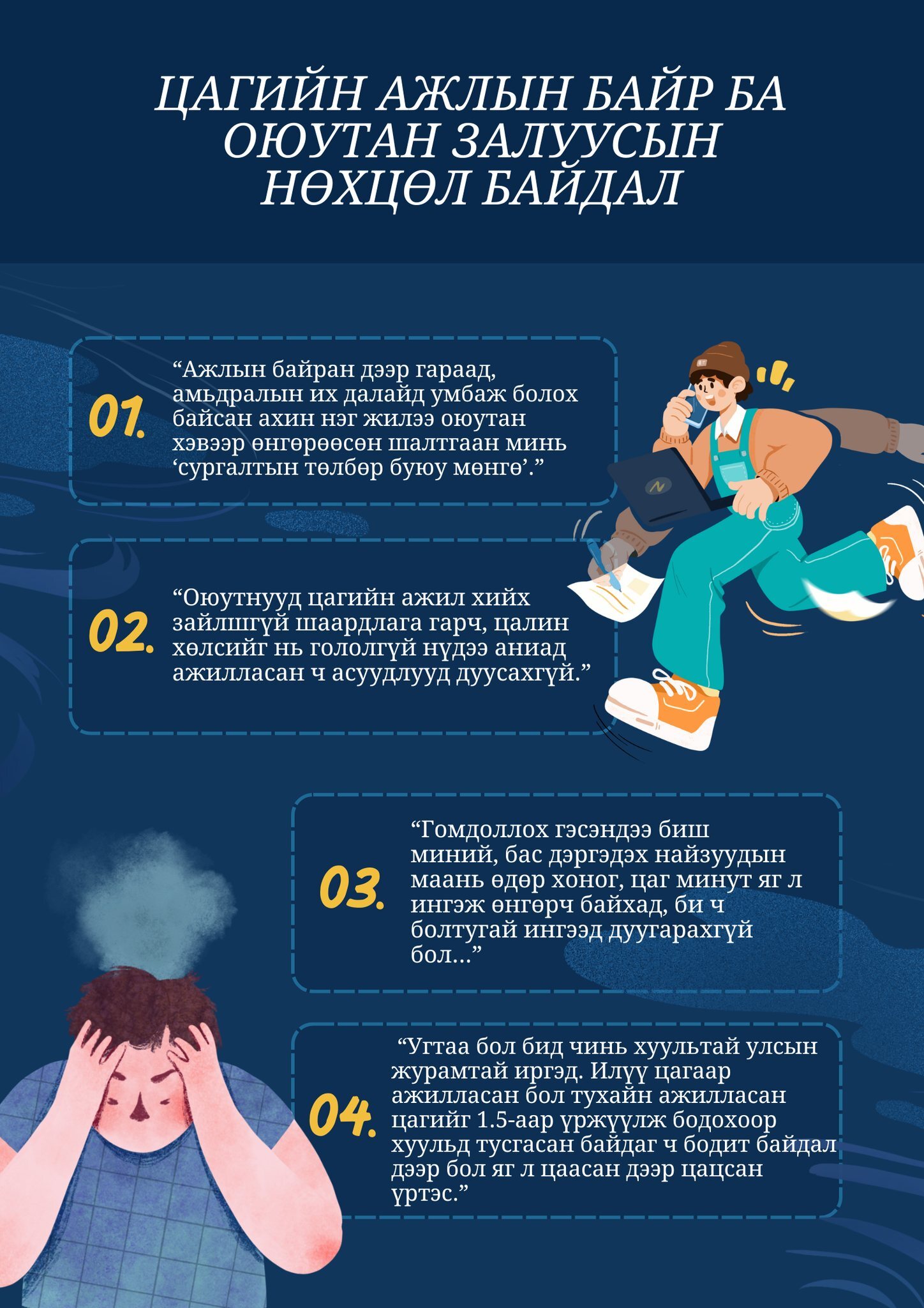 Оюутнууд цагийн ажил хийх зайлшгүй шаардлага гарч цалин хөлсийг нь гололгүй нүдээ аниад ажилласан ч асуудлууд дуусахгүй. Хөдөлмөрийн гэрээ байгуулахгүй удааж, ажилласан өдрүүдийнх нь цалинг өгөхгүй хөөгөөд гаргах газрууд, илүү цагаар морь нохой мэт зүтгүүлчхээд өдрийн найман цагаар л цалин бодож залхаан цээрлүүлэх удирдлагууд гээд л... Жишээлбэл, миний их л ойрын нэг хүн монголдоо нэлээд нэр бүхий алдартай ресторанд зургаан сар орчим ажиллаж байсан юм. Хуульдаа ажилтны долоо хоногт ажиллах дундаж цаг нь 40, дээд хязгаар нь 56 цаг байдаг бол тухайн найзын маань ажиллаж байсан ресторан үндсэн зөөгч нараа нэг өдөрт хамгийн багадаа 14 цаг ажиллуулдаг, цаашлаад удирдах албан тушаалтнууд нь долоо хоногт 5-аас дээш өдөр ажиллахыг шаарддаг байсан тухай надад ярьж байв. Рестораны ачаалал ихтэй, маргааш өглөө нь захиалга ихтэй өдрүүдэд өдөрт 16 цаг хүртэл сунах буюу долоо хоногт ойролцоогоор 70-80 цаг ажилладаг боловч илүү цагийн цалин бодох байтугай нэг долоо хоногт дээд тал нь 60 цагийн ажлыг энгийн ажлын хөлсөөр бодож цалинг нь тавьдаг байсан гэнэ. Угтаа бол аль хэдийн хийчхээд байгаа хөдөлмөрийн хөлс шүү дээ.