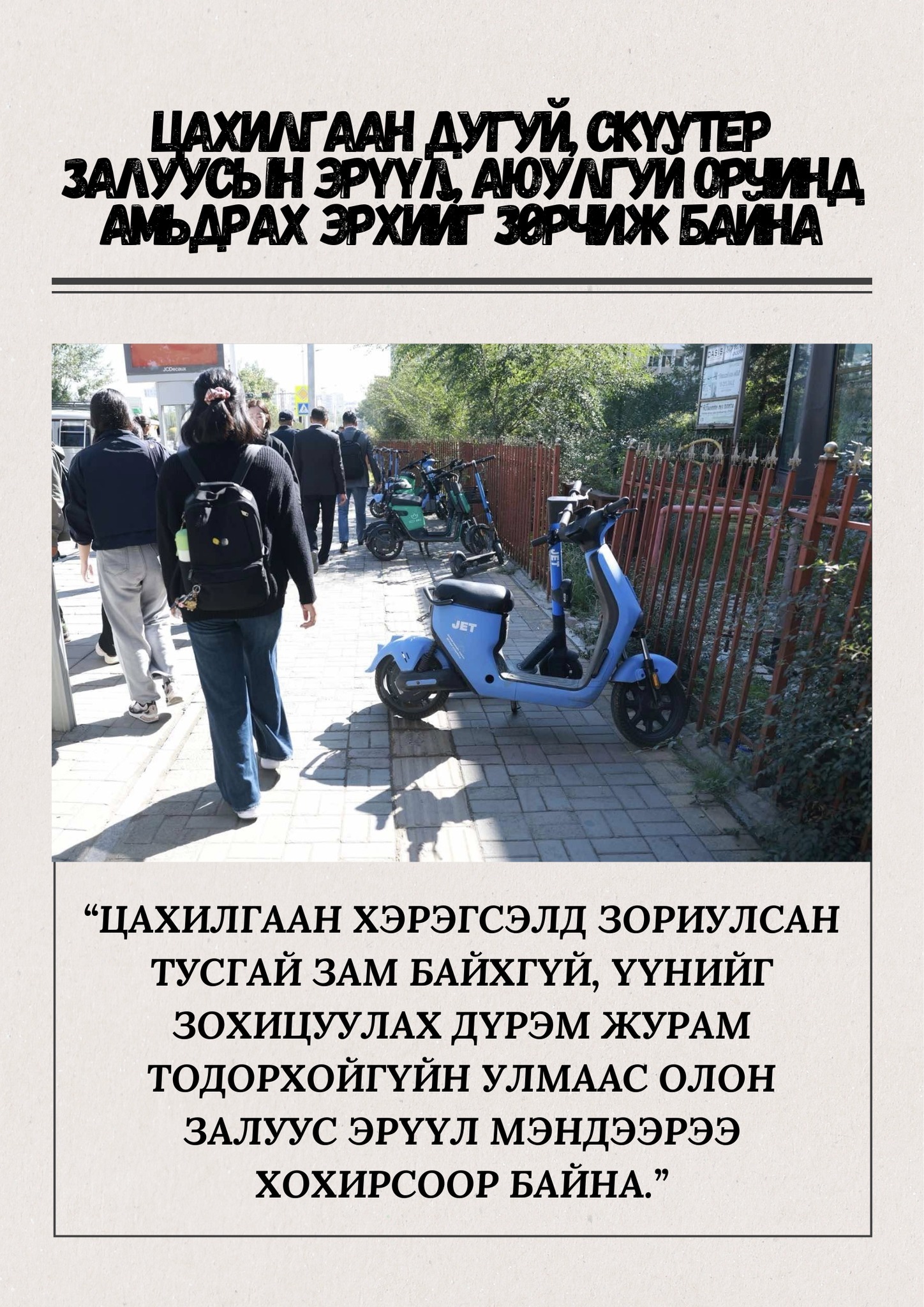 Хотын гудамжаар алхах бүрд л моторын дуу, бас цахилгааны зөөлөн шуугиан сонсогддог болоод удаж байна. “Jet”, “Tapa” гэх нэрс өнөөдөр залуус бидний өдөр тутмын амьдралын нэг хэсэг болчихсон. Цахилгаан скүүтер, дугуй бол зүгээр нэг унаа биш, хотын хэмнэл өөрчлөгдөж байгаагийн дохио мэт надад санагддаг.