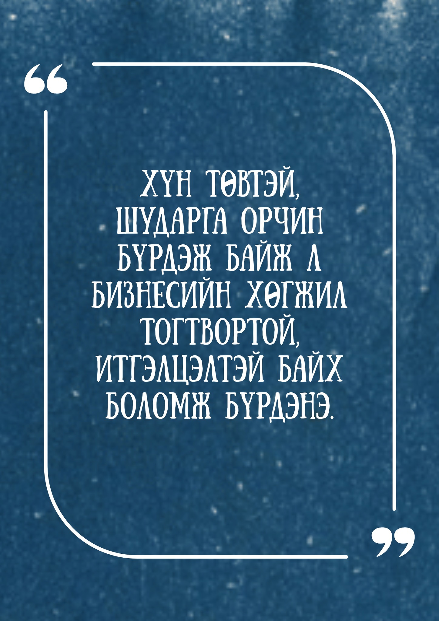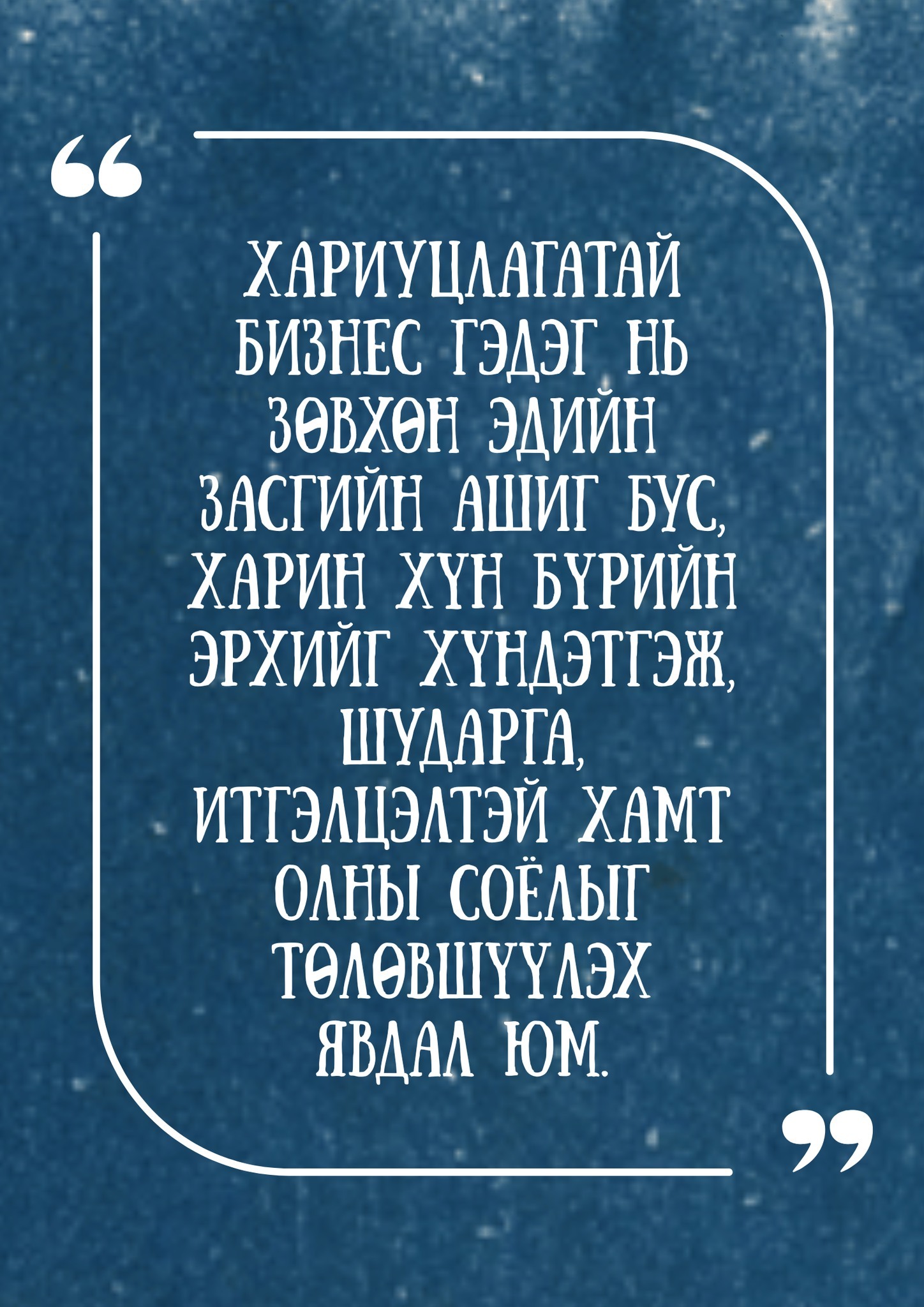 Эцэст нь хэлэхэд, хариуцлагатай бизнес гэдэг нь зөвхөн эдийн засгийн ашиг бус, харин хүн бүрийн эрхийг хүндэтгэж, шударга, итгэлцэлтэй хамт олны соёлыг төлөвшүүлэх явдал юм. Ийм зарчимд тулгуурласан байгууллагууд л залуусын итгэлийг олж, урт хугацааны хөгжлийн бодит суурь болж чадна.